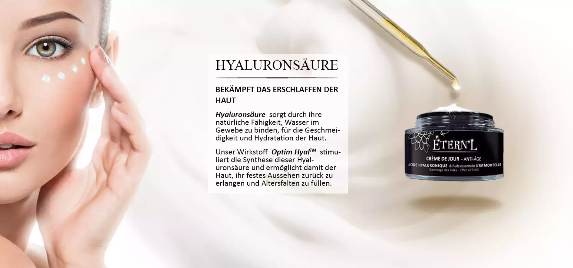 Unser Wirkstoff Optim HyalTM stimuliert die Synthese dieser Hyaluronsäure und ermöglicht damit der Haut, ihr festes Aussehen zurück zu erlangen und Altersfalten zu füllen.