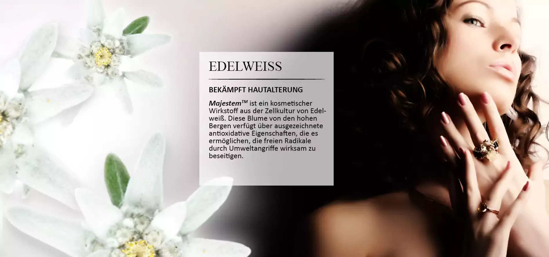 MajestemTM ist ein kosmetischer Wirkstoff aus der Zellkultur von Edelweiß. Diese Blume von den hohen Bergen verfügt über ausgezeichnete antioxidative Eigenschaften, die es ermöglichen, die freien Radikale durch Umweltangriffe wirksam zu beseitigen.
