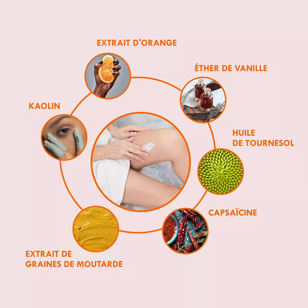Crème amincissante de jour MOEA (150 ml): AQUA, HELIANTHUS ANNUUS SEED OIL, GLYCERIN, CAPRYLIC/CAPRIC TRIGLYCERIDE, CETEARYL ALCOHOL, CETEARYL GLUCOSIDE, CETYL ALCOHOL, CAPSAICIN, BRASSICA ALBA SPROUT EXTRACT, CITRUS SINENSIS FRUIT WATER, GLYCERYL STEARATE, VANILLYL BUTYL ETHER , SODIUM STEAROYL GLUTAMATE, TOCOPHERYL ACETATE, XANTHAN GUM, PARFUM, POTASSIUM SORBATE, SODIUM BENZOATE, CI 15985, BENZYL ALCOHOL, DEHYDROACETIC ACID, CITRIC ACID, LIMONENE, LINALOOL.